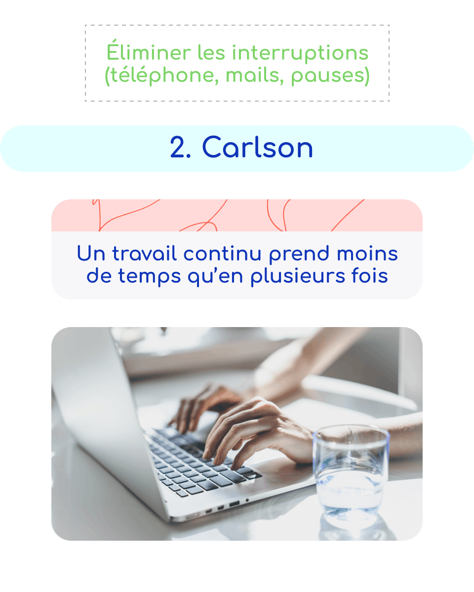 | Carlson | Un travail continu prend moins de temps qu’en plusieurs fois | Éliminer les interruptions (téléphone, mails, pauses) | Pendant les tâches complexes nécessitant concentration |