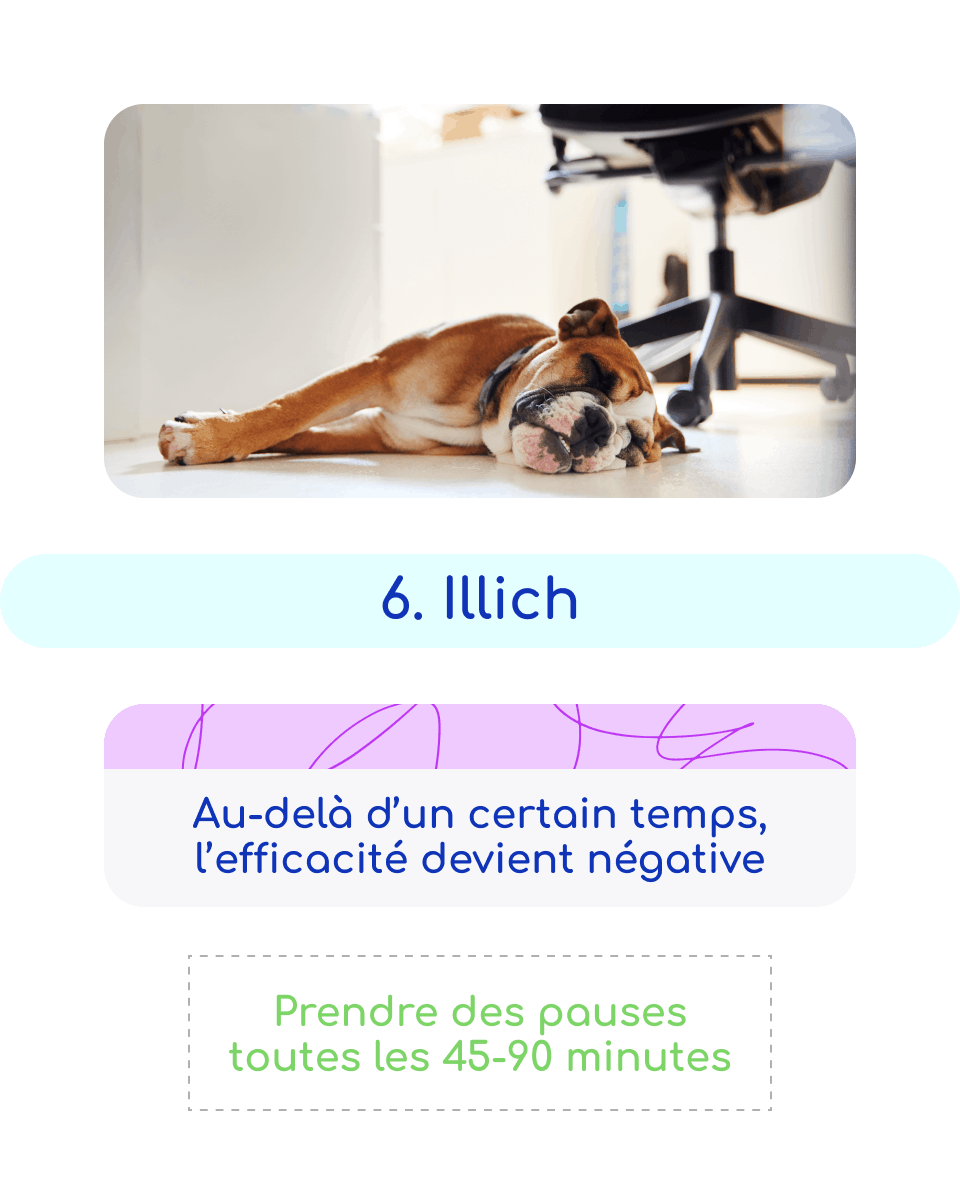 | Illich | Au-delà d’un certain temps, l’efficacité devient négative | Prendre des pauses toutes les 45-90 minutes | Tout au long de la journée |