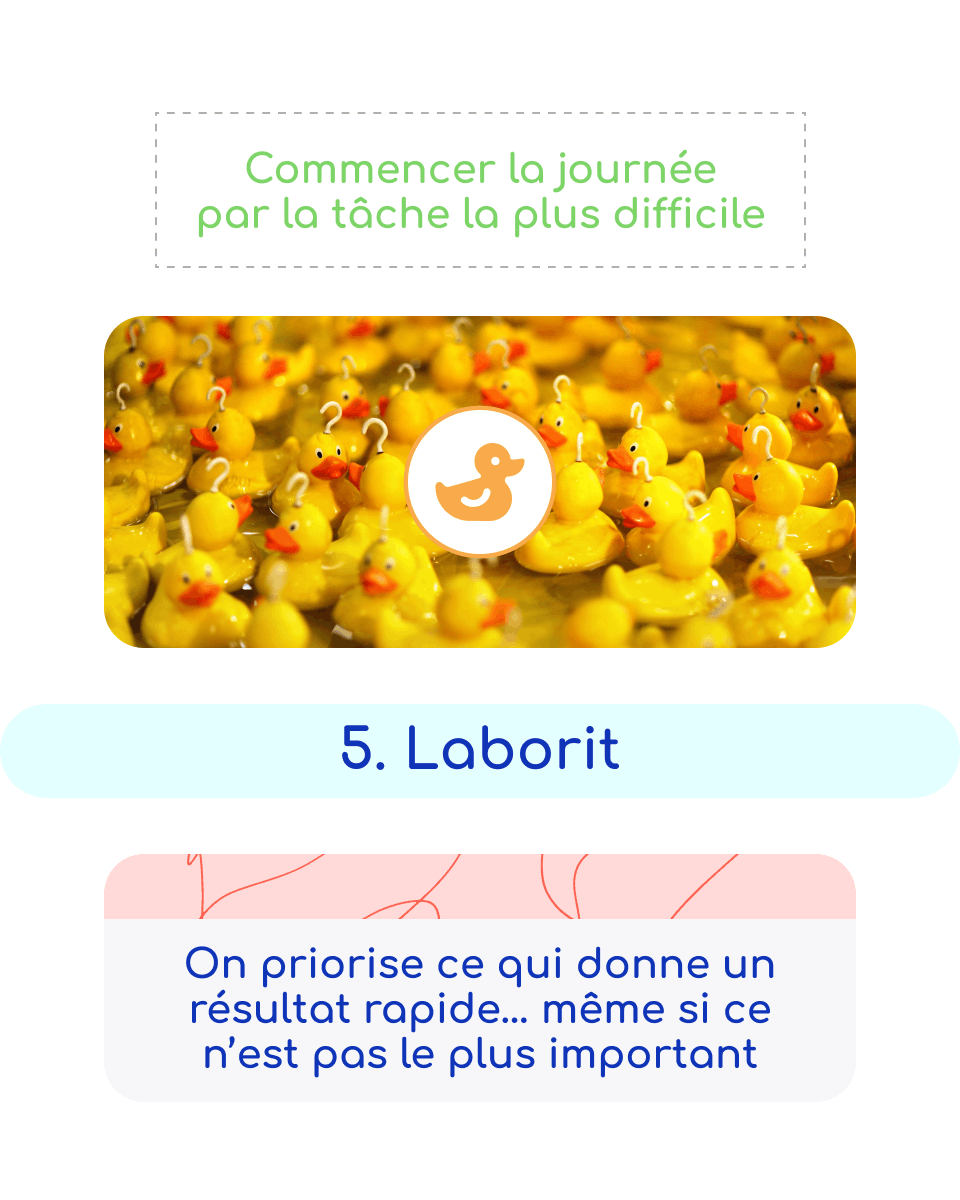 | Laborit | On fait d’abord ce qui procure satisfaction immédiate | Commencer la journée par la tâche la plus difficile | Chaque matin, dès l’arrivée |
