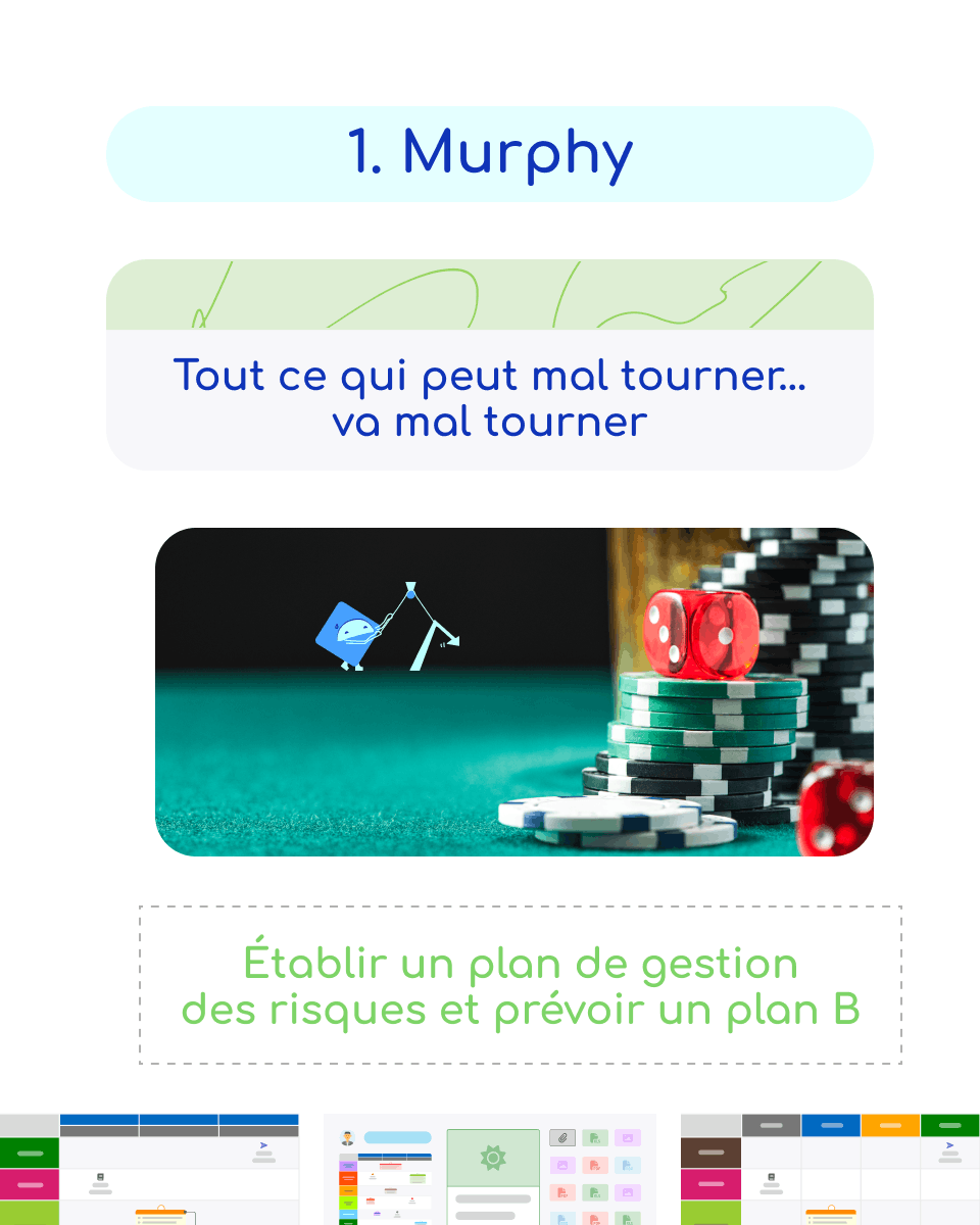 En gestion de projet pour contrer cette Loi (du moins limiter son impact sur votre travail), il est indispensable d’établir un plan de gestion des risques. Et oui, vous n’êtes jamais à l’abri de faire face à certains imprévus.