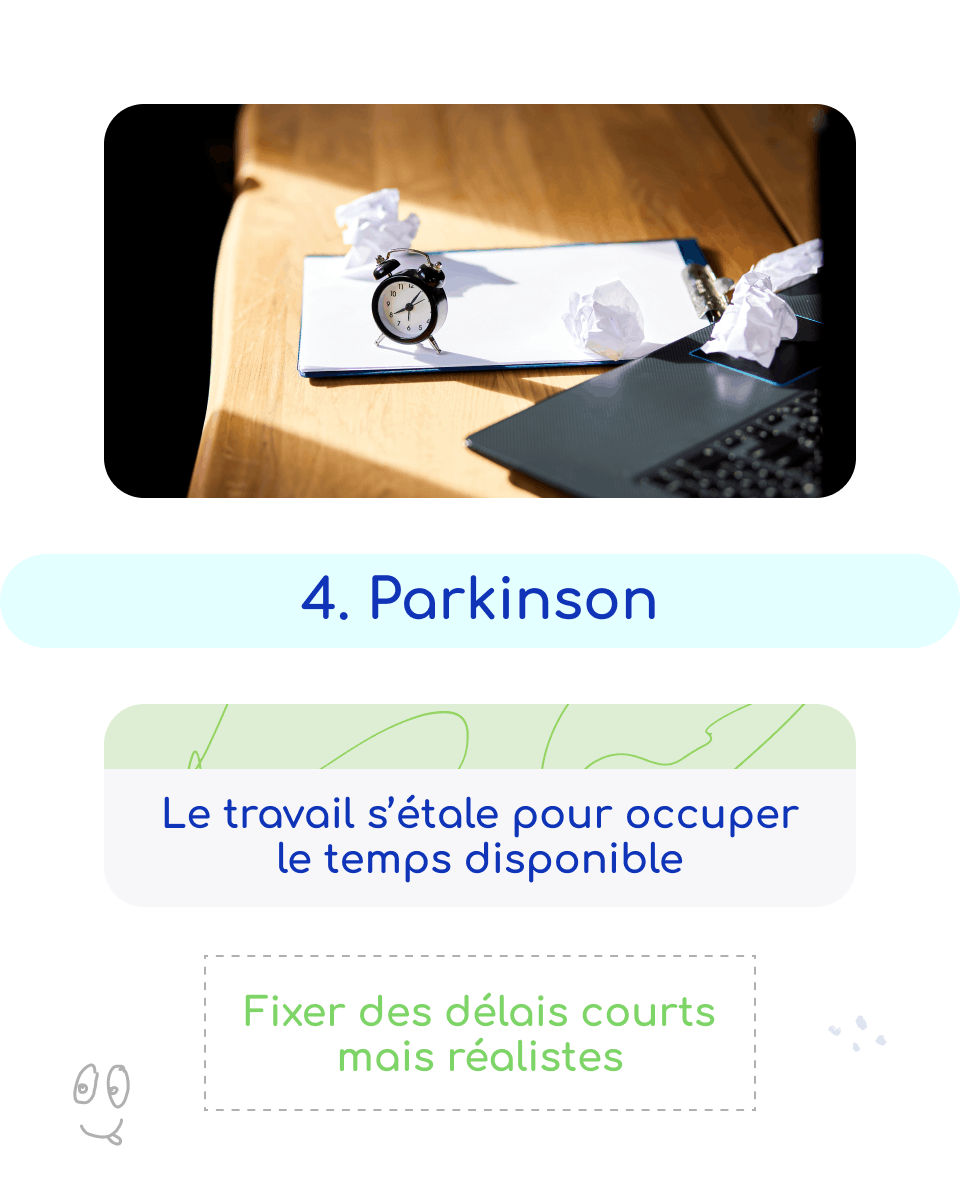 | Parkinson | Le travail s’étale pour occuper le temps disponible | Fixer des délais courts mais réalistes | À chaque attribution de tâche |