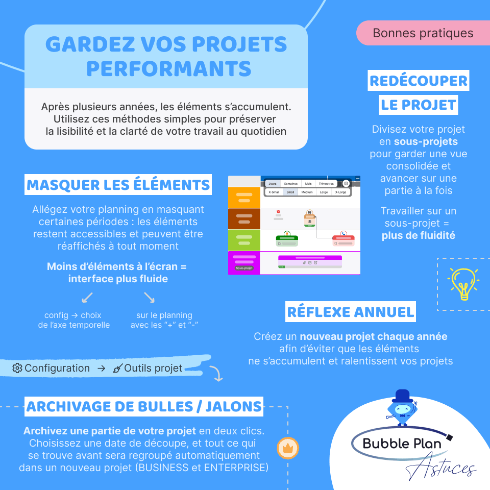 Garder un planning fluide dans Bubble Plan devient simple lorsqu’on adopte quelques bonnes habitudes. Masquer des éléments, découper vos projets, créer un nouveau planning chaque année ou archiver vos bulles et jalons sont autant de gestes simples qui améliorent la lisibilité, facilitent l’organisation et vous font gagner du temps.