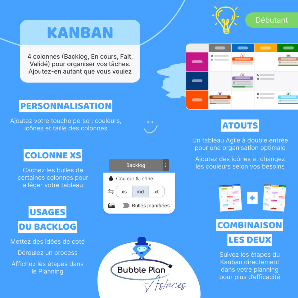 Le Kanban, c’est un tableau visuel qui vous permet d’organiser vos tâches par statut (Backlog, En cours, Fait, Validé, etc.). Un classique de la gestion de projet qui a fait ses preuves pour suivre l’avancement de vos actions en un coup d’œil.