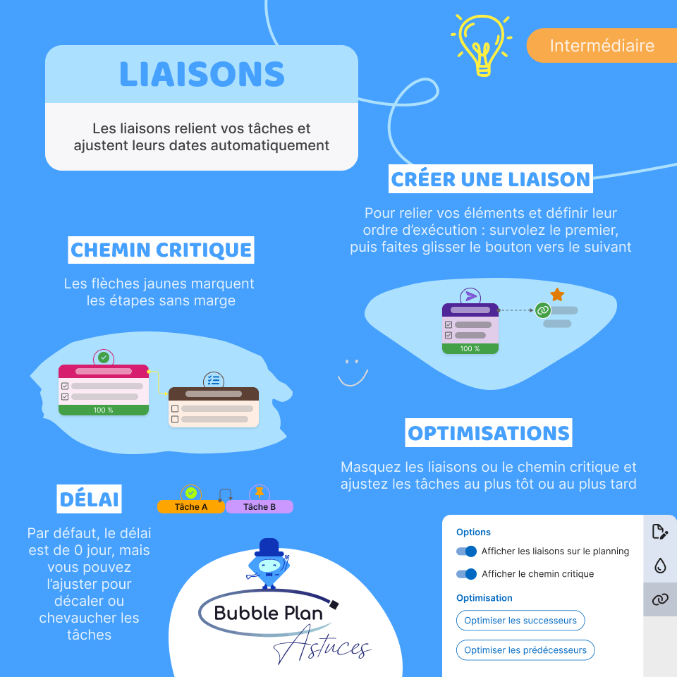 Une liaison permet de relier deux éléments d’un même projet entre eux. C’est un incontournable en gestion de projet : ça vous aide à visualiser les enchaînements de tâches, à repérer ce qui bloque et à garder une cohérence dans votre planning.