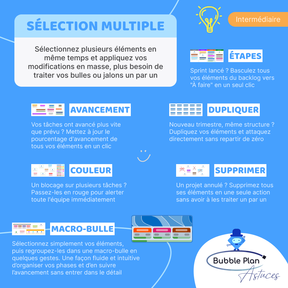La sélection multiple se trouve directement depuis votre planning. Pour l’activer, sélectionnez plusieurs éléments en même temps, bulles ou jalons. Une icône apparaît automatiquement dans votre menu de droite. C’est depuis là que toute la magie opère.